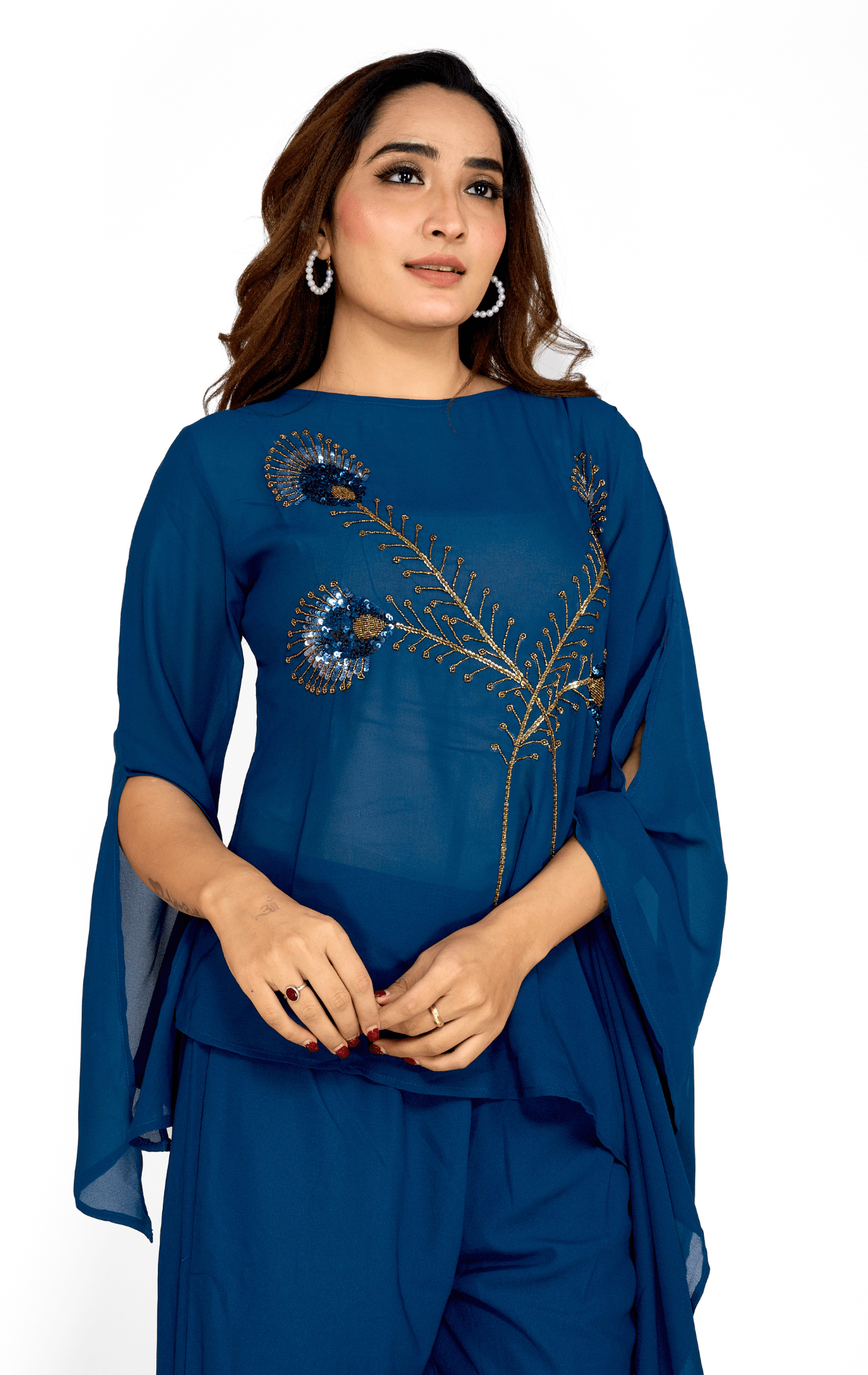 Step into elegance with this dark purple co-ord set, featuring sequin and bead work on a lightweight georgette fabric. Perfect for parties and special occasions.