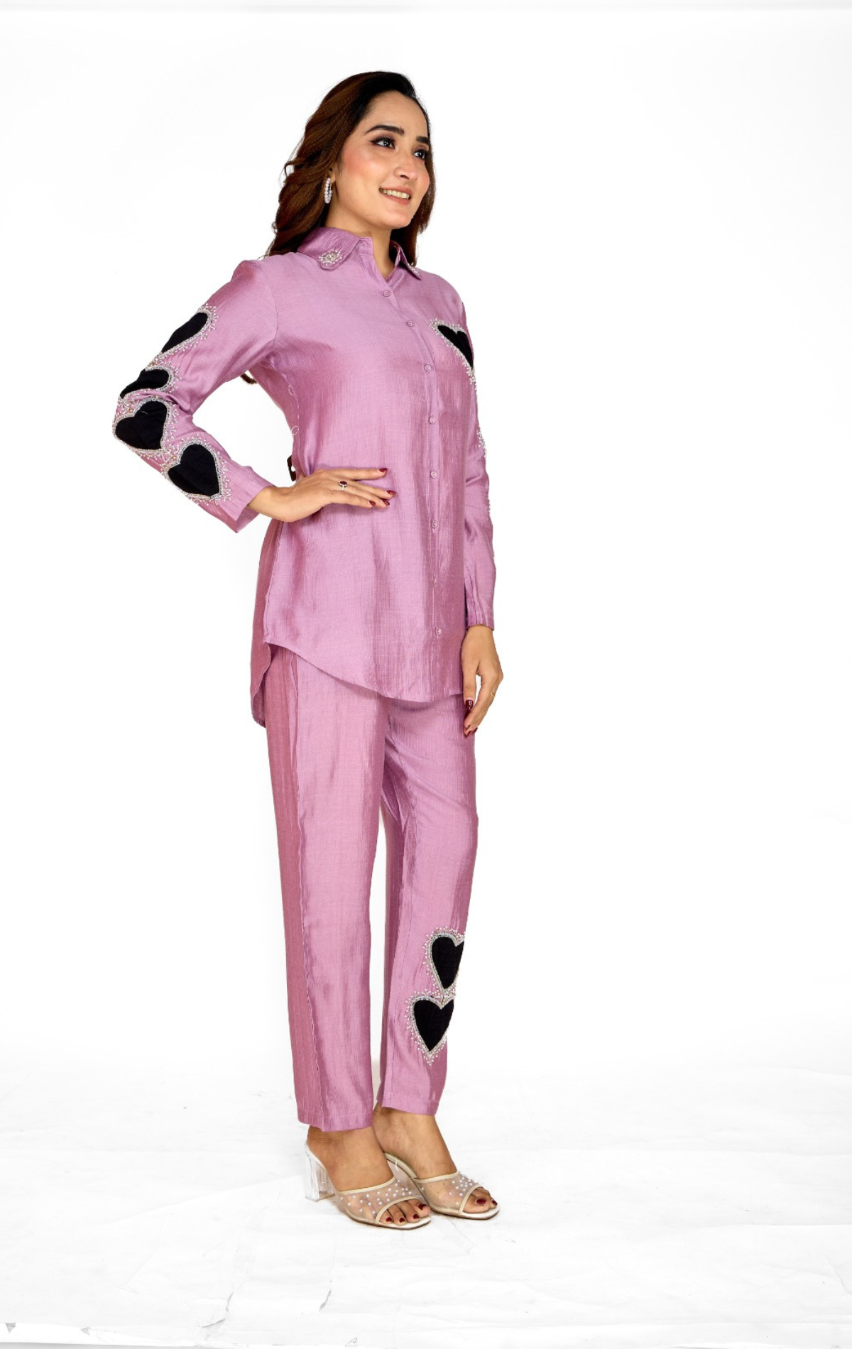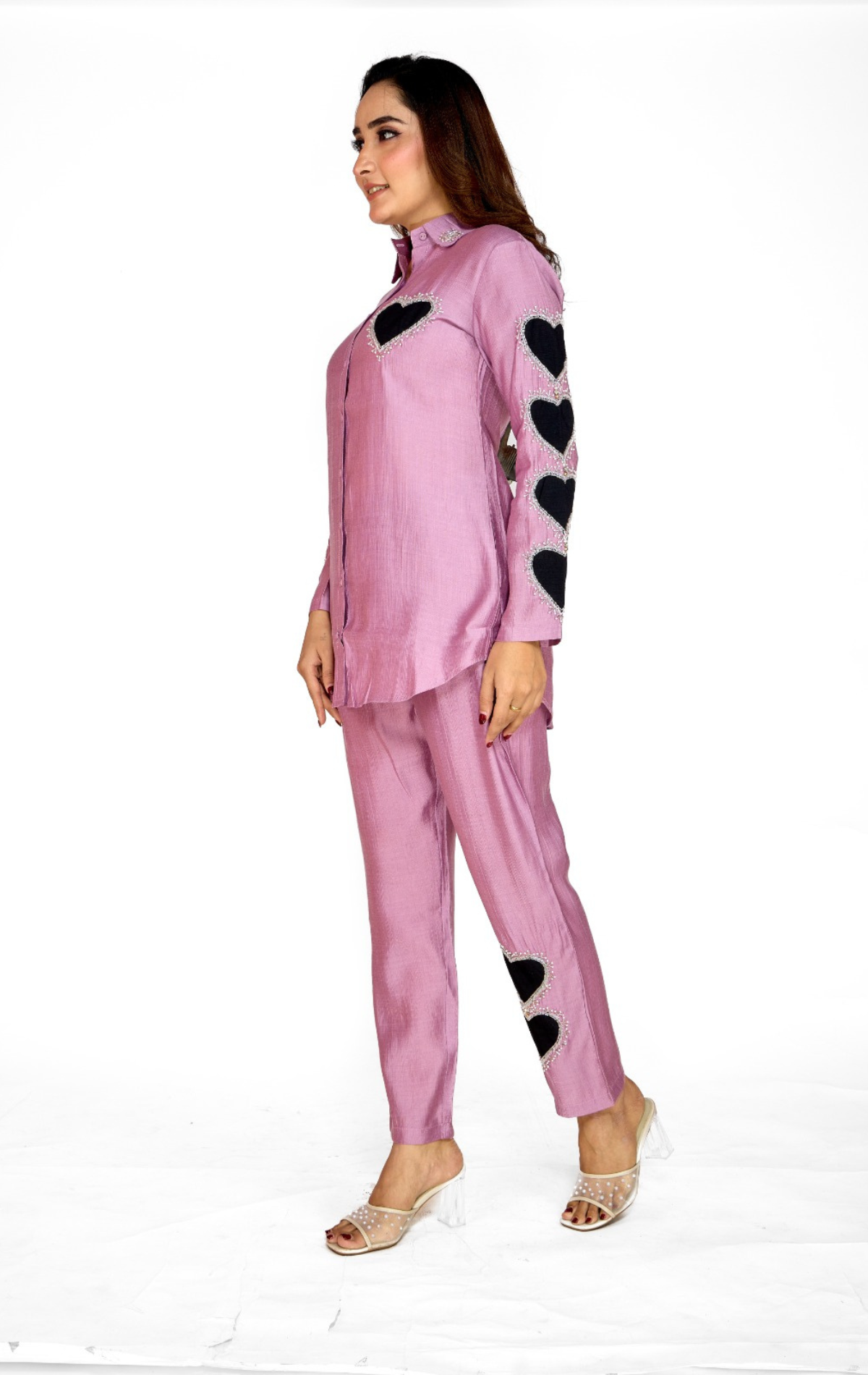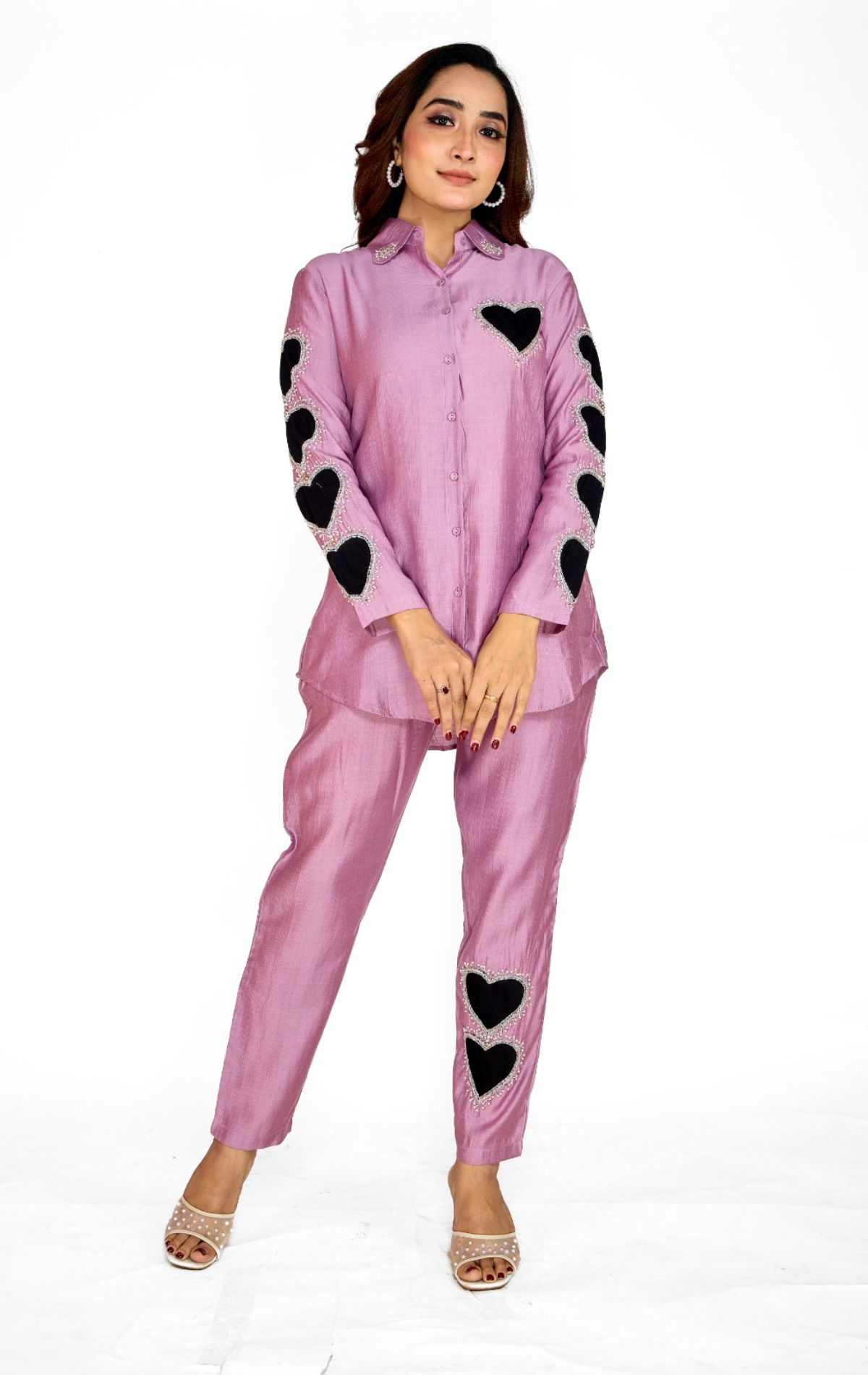 - Stylish purplish pink co-ord set with intricate sequin heart work