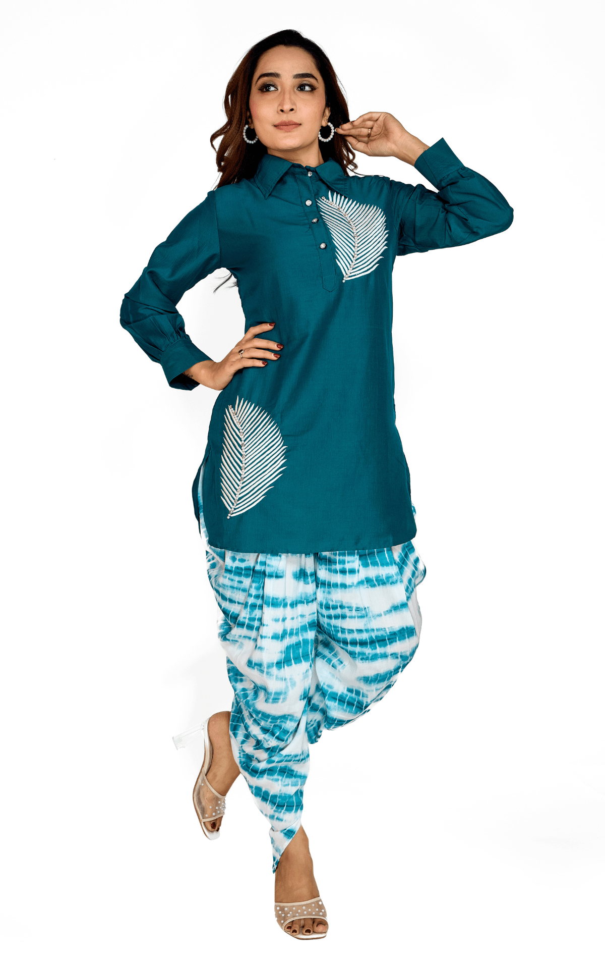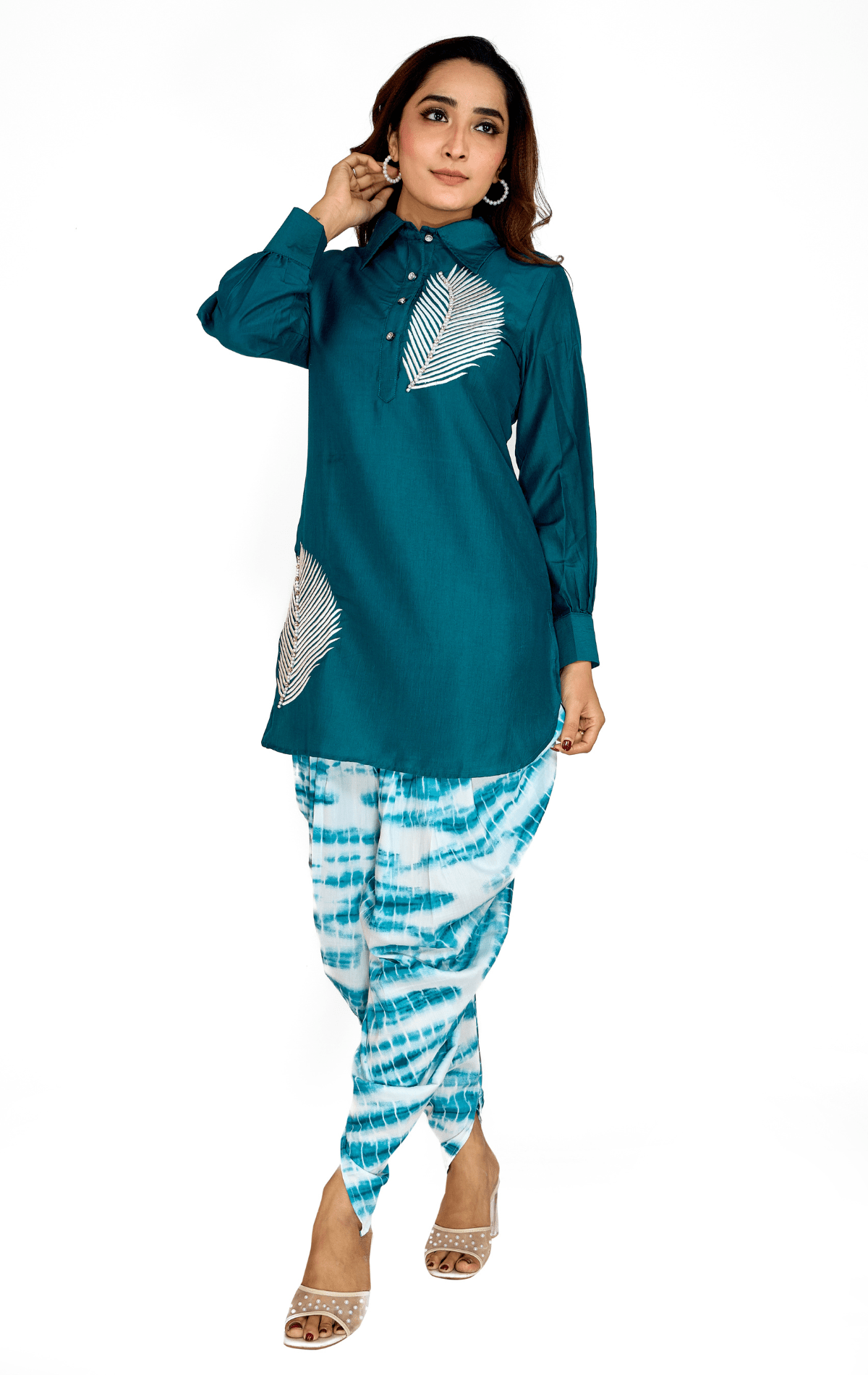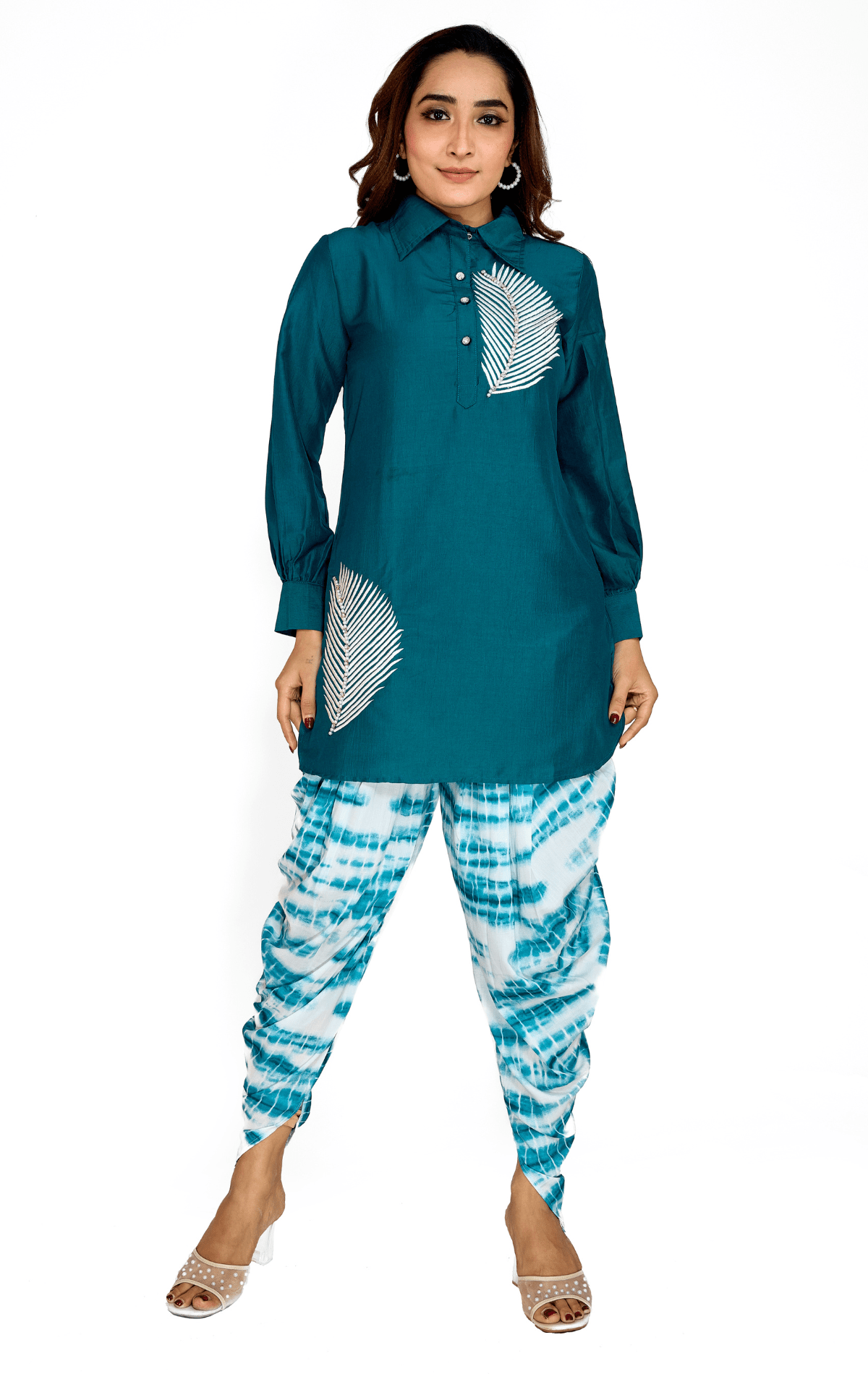 Make a bold statement with this dark green designer co-ord set, featuring threadwork embroidery and sequin detailing. Paired with trendy tie and dye dhoti pants, this outfit blends tradition with modern style, perfect for any occasion.